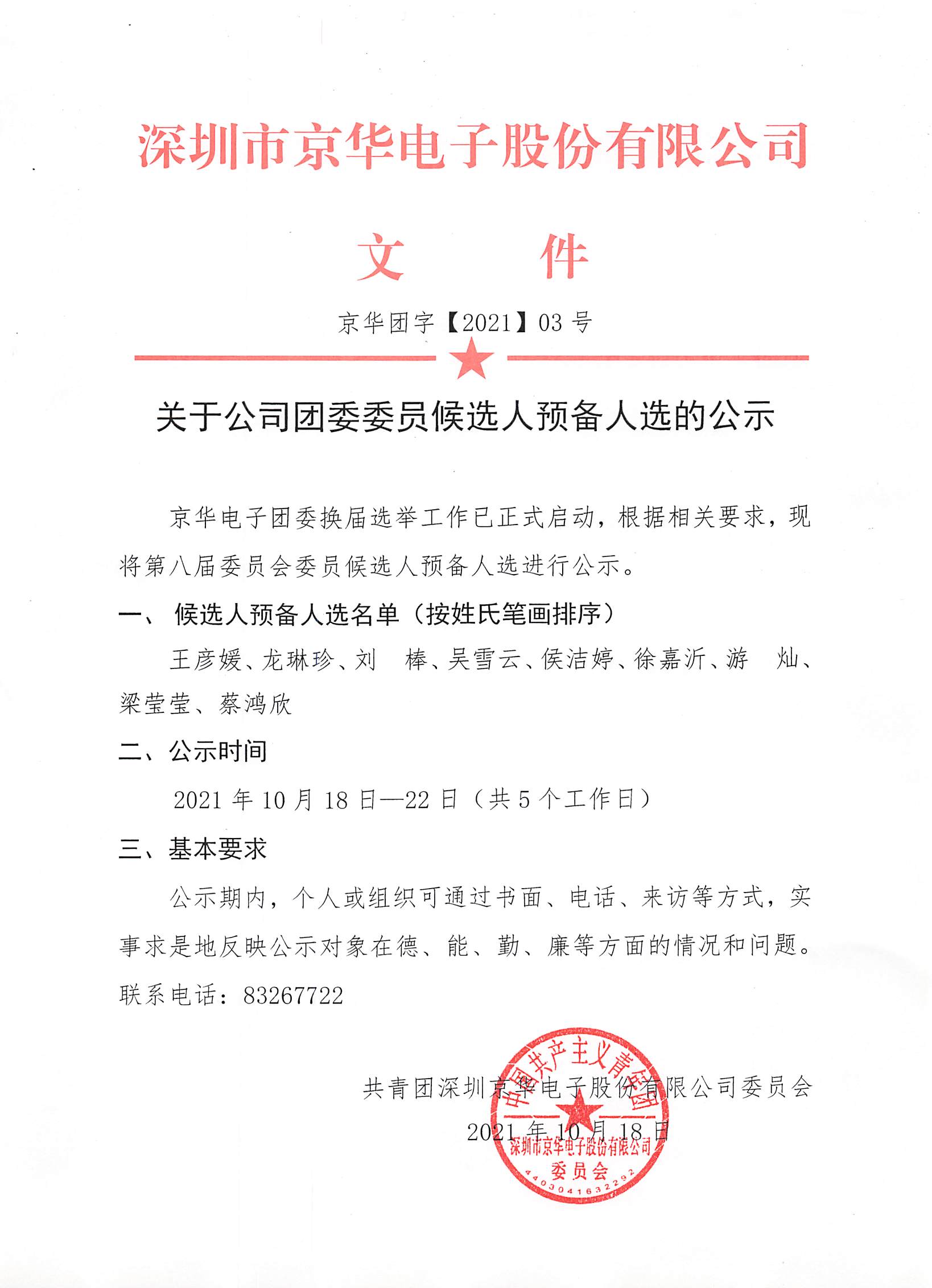 關于公司團委委員候選人預備人選的公示