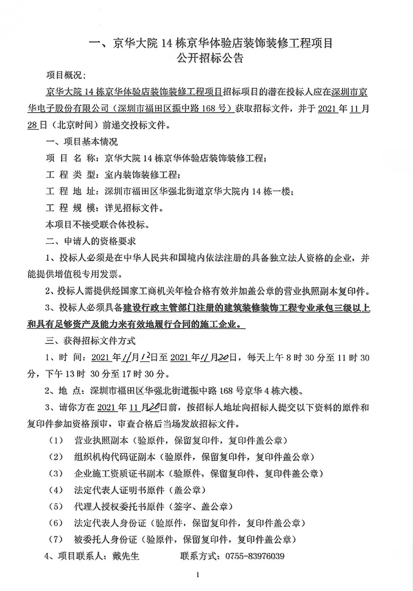 京華大院14棟京華體驗店裝飾裝修工程項目公開招標公告