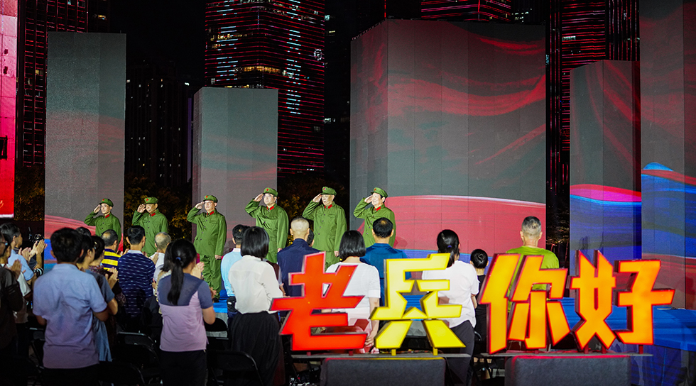 夜幕降臨,軍號響起,儀仗兵向老兵致敬。市民中心廣場周邊的樓宇建筑瞬間被耀眼奪目的燈光點(diǎn)亮,“老兵你好”“向老兵致敬”等宣傳標(biāo)語映紅天際。千部無人機(jī)騰空而起,在夜空中靈動飛舞,先后編排出改革開放45周年、大鵬展翅、軍號、八一軍旗等造型畫面與市民中心廣場絢麗的舞臺交相輝映。參加節(jié)目錄制的老兵們身著戎裝,與市民群眾共賞這場光影盛宴。