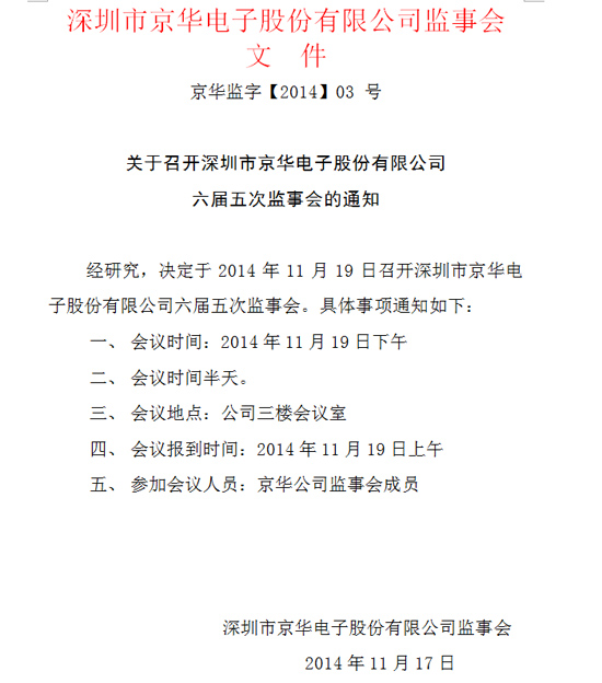 關于召開深圳市京華電子股份有限公司六屆五次監事會的通知